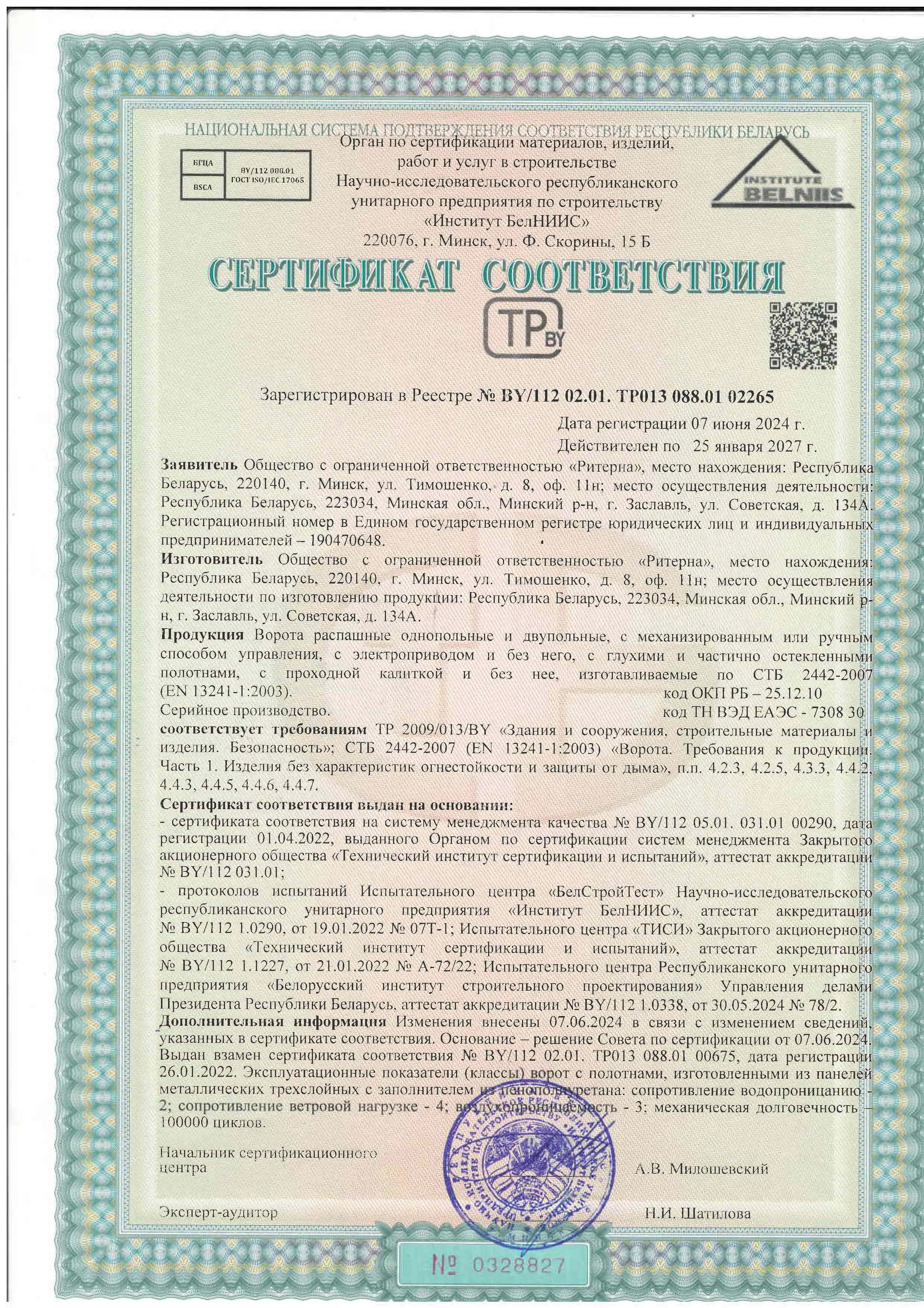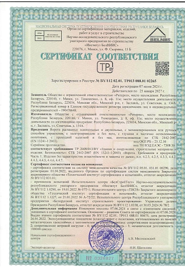 Компания ООО «Ритерна» уделяет особое внимание качеству и безопасности выпускаемой продукции. Соответствие продукции установленным требованиям подтверждено сертификатами соответствия, декларациями и свидетельствами, выданными аккредитованными органами по сертификации.